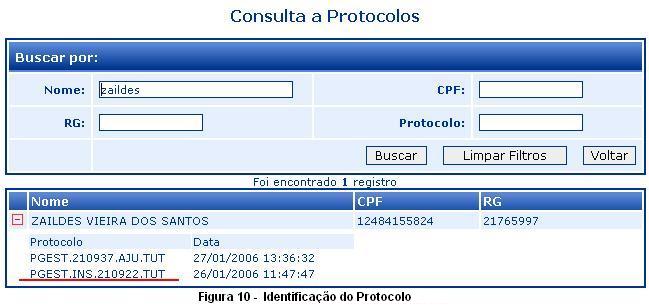 Conforme já foi indicado, preencha o bloco Buscar por (Nome ou RG ou CPF) ou o número do Protocolo (Figura 9).